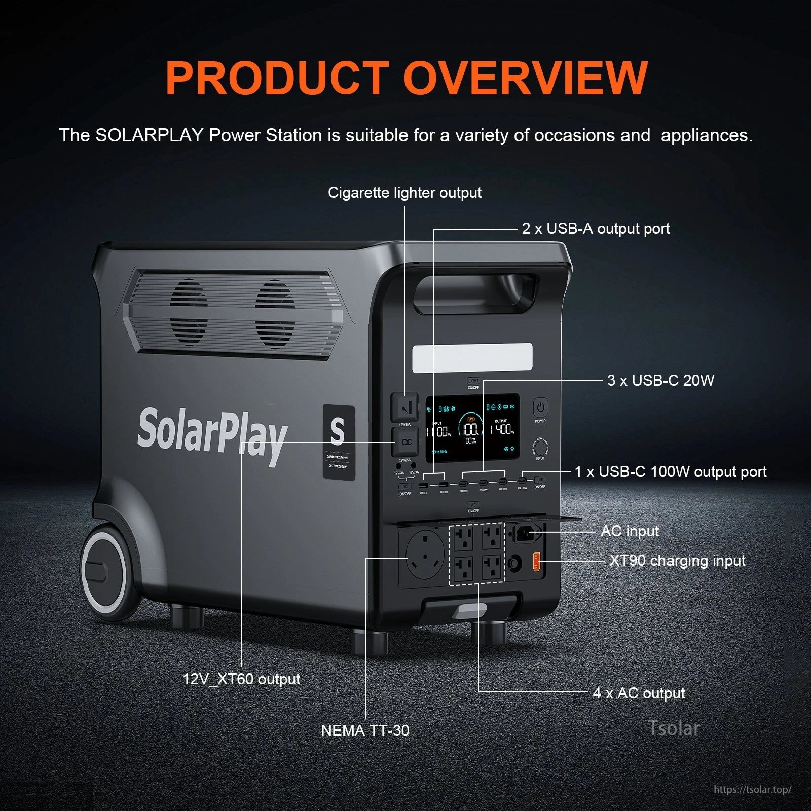SolarPlay Q3600 offers AC, USB-A/C, XT90, NEMA TT-30, and cigarette lighter outputs for versatile device charging. (17 words)
